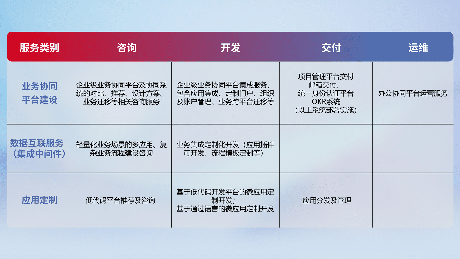 针对钉钉、、、企微、、、、IDaas等平台级产品提供产品的规划、、、、方案、、、、交付、、定制化开发等服务,,实现如统一协同办公、、、智能客户服务、、混合会议管理、、、智能数据查询、、、、等业务场景,,,实现数字化转型。。