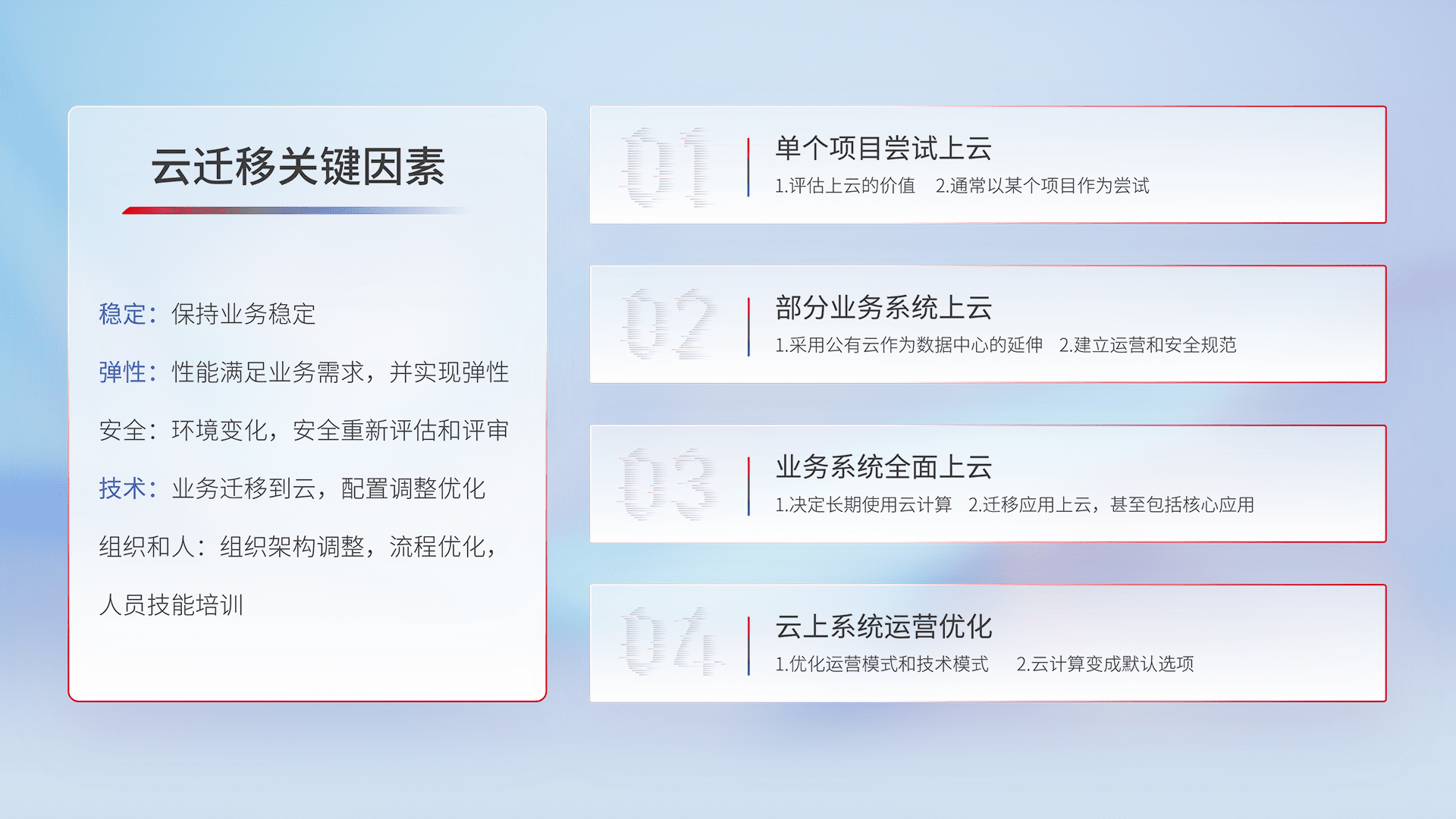 结合实际业务,,,,从规划设计、、云平台选型、、、云原生改造、、、、数据迁移、、集成交付,,迁移全过程为客户识别最佳上云路径,,,做好风险识别管理,,,设计网络架构、、、、身份权限、、安全审计合规、、操作审计、、日志审计、、、、监控告警策略、、多站点容灾设计等,,,,对云上基础设施进行整体规划,,提升IT治理水平,,以满足弹性、、高可用、、、、高性能的需求。。。。