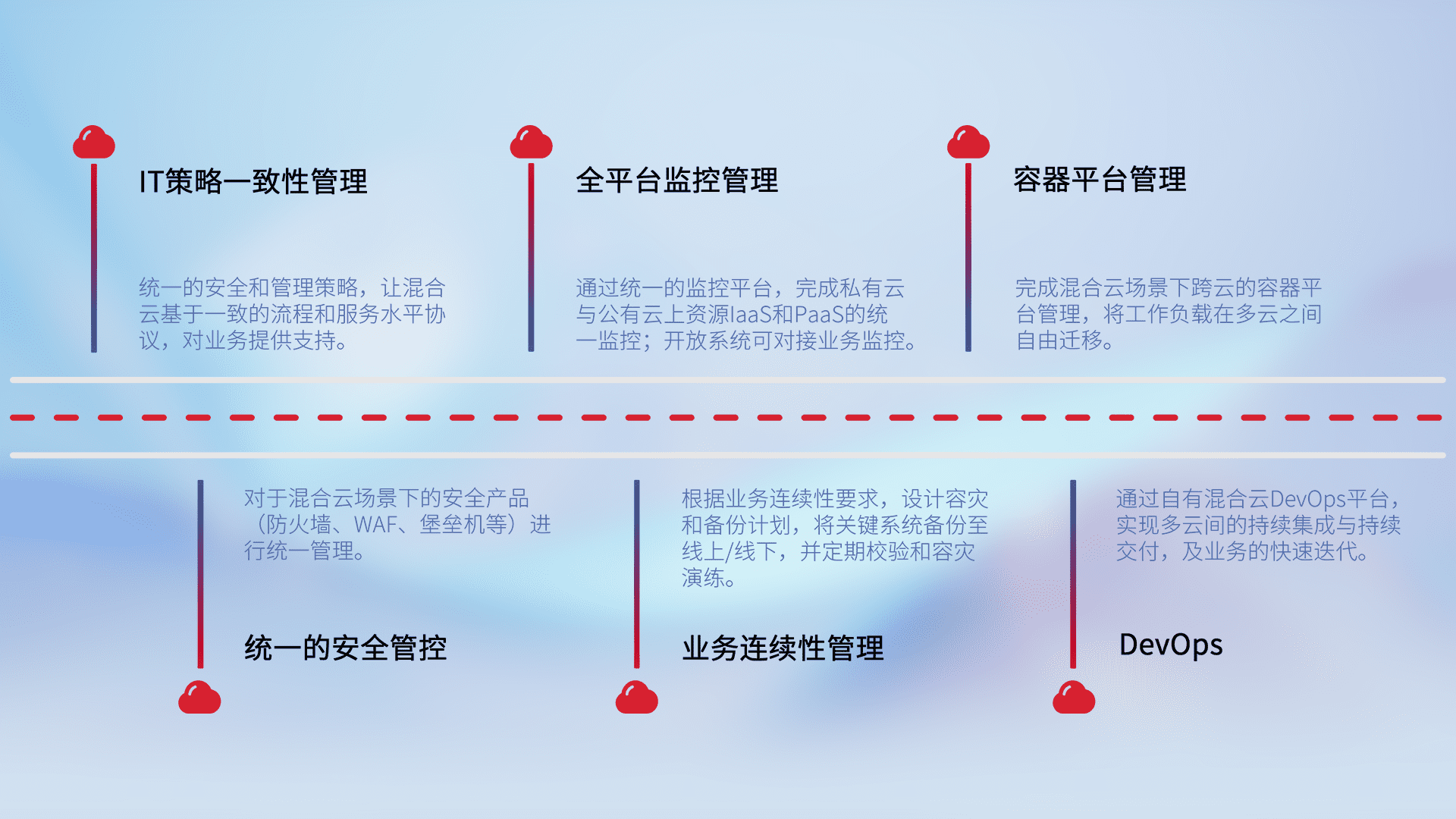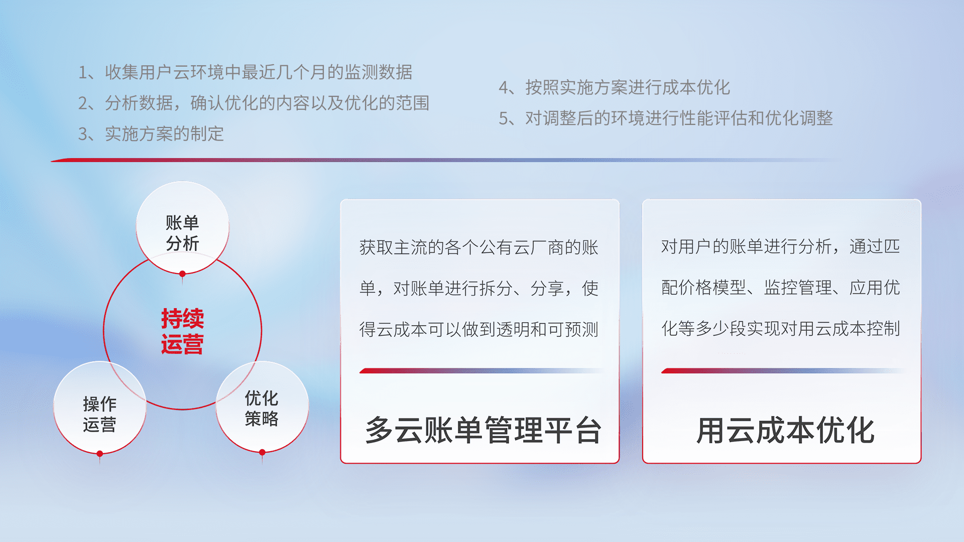 通过多云纳管,,,,以统一的资源数据模型把客户的云资源进行抽象和封装,,,,进而实现对多云资源的统一操作,,,保障云资源管理的可靠性、、稳定性与可用性。。。量身定制化运维内容,,,,配置、、、、开发运维、、、、补丁管理、、、、备份、、、监控、、、认证和访问管理、、审计和日常巡检等,,,,保障在用云过程中的可靠度,,,稳定度以及高可用率。。。。
